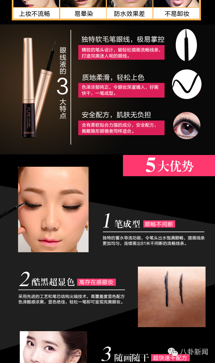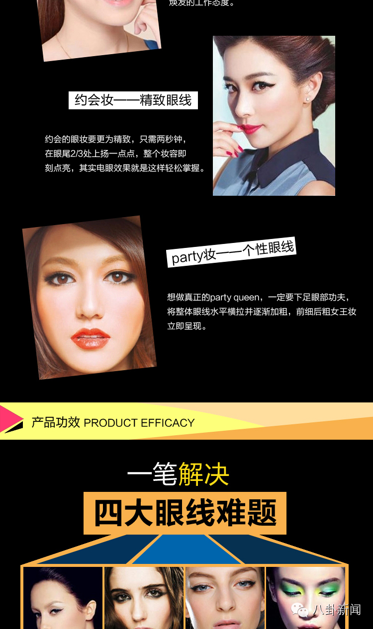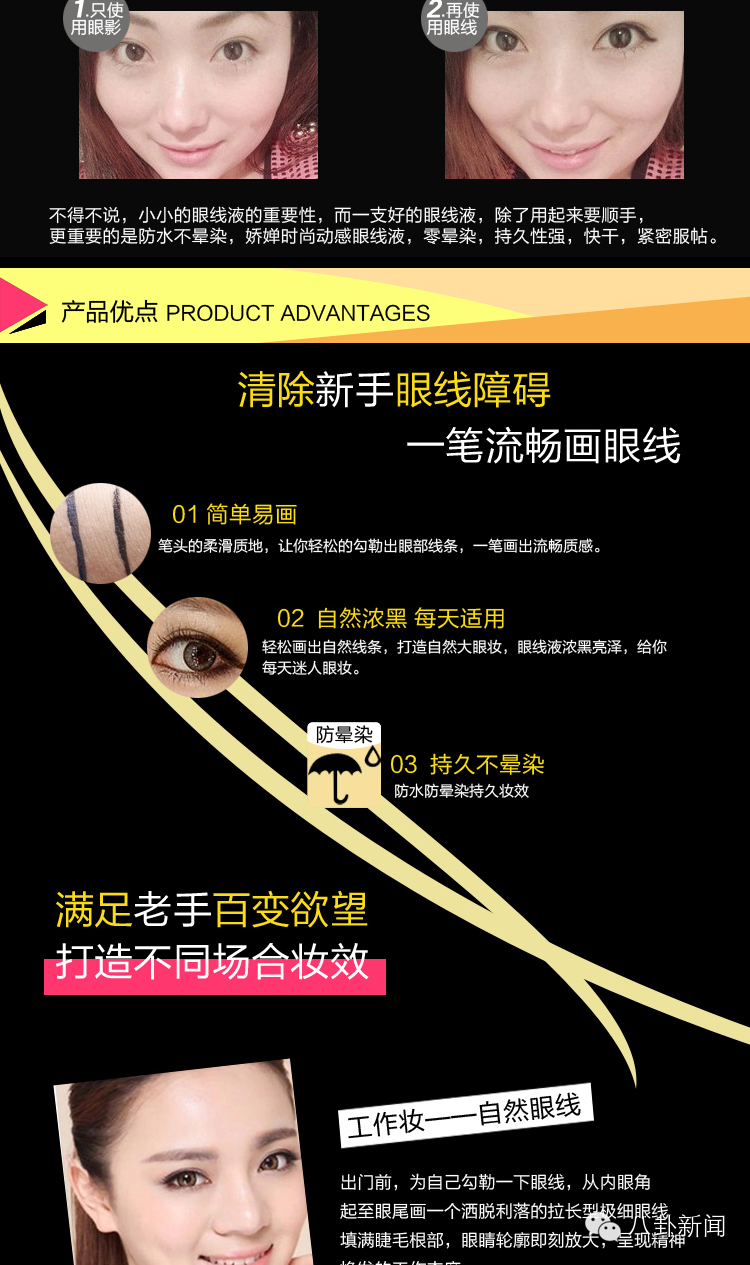 一笔成型,使用简易:线条可粗可细,一笔就能画出极具质感的眼线;
