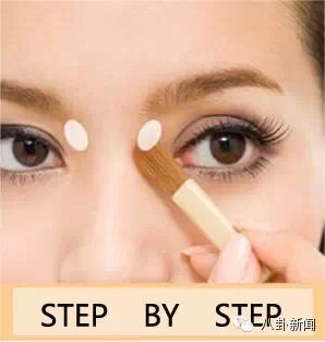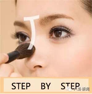 STEP 7:除了鼻影外,打高光也是让我们的五官看上去深邃的好方法。同时也能够塑造小脸哦!在T字区薄薄地刷上高光粉,注意T字范围不能太宽,否则有反效果。